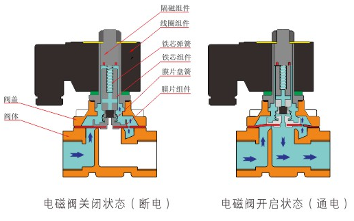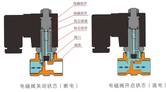 原理:开云官方端网站登录入口-开云online(中国)直动式电磁阀分常闭型和常开型两种。常闭型电磁阀断电时为关闭状态,线圈通电时产生电磁力,动铁芯跟静铁芯吸合,电磁阀阀口打开,介质(流体)通过;当电磁阀线圈断电时电磁阀消失,在弹簧的作用力下,电磁阀动铁芯复位,阀口关闭,介质(流体)不同,电磁阀呈关闭状态。常开型与之相反。